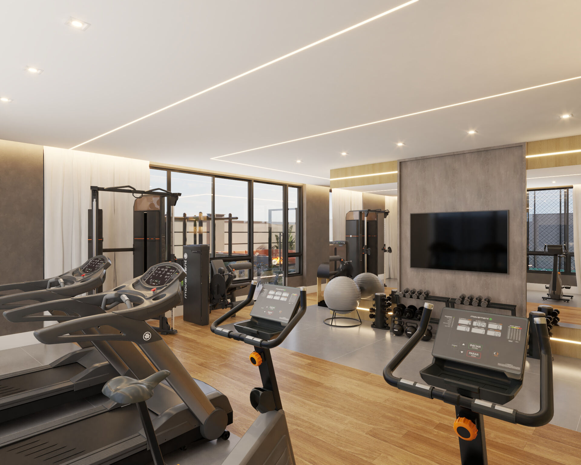 Área de lazer divididas em dois pavimentos, com piscina aquecida, boliche, mini mercado, lavanderia coletiva, salão de festas, coworking, e academia no rooftop.